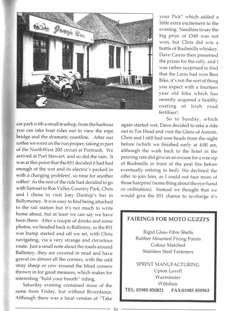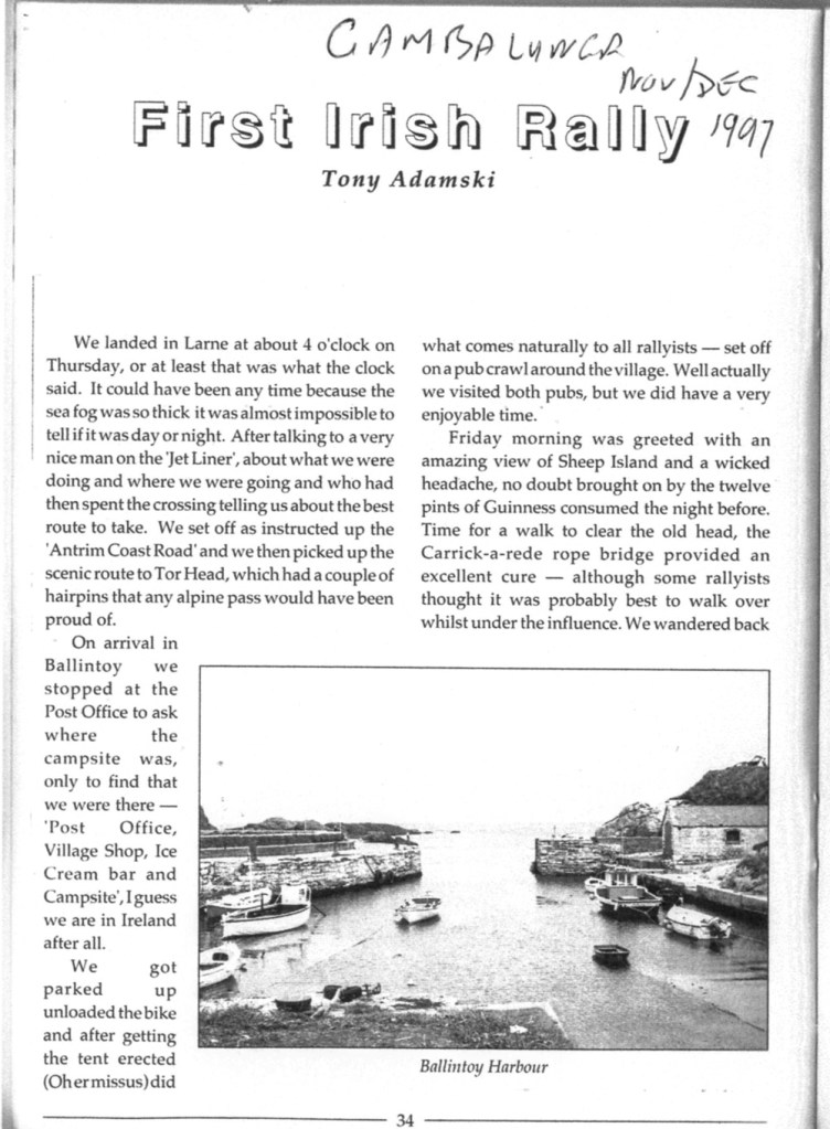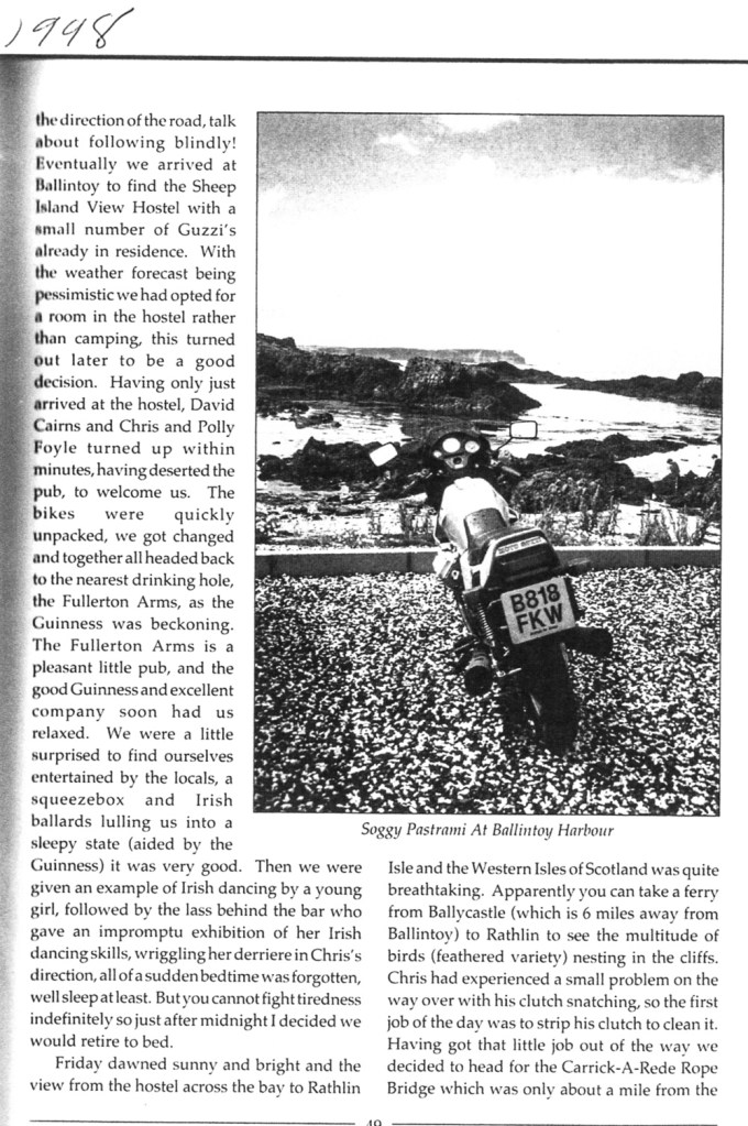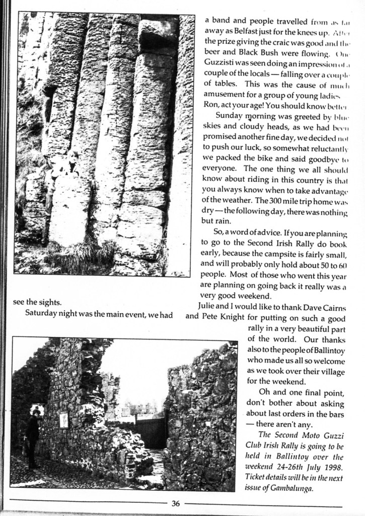 When organising a Moto Guzzi Ulster Rally 2 at Ballintoy, north coast, in 2010, I discovered there had been Moto Guzzi Club GB Irish Rallies at this very location in 1997 and 1998, organised by Davy Cairns, or in conjunction with DC. Bob Berwick from Great Harwood sent me these articles from Gambalunga.