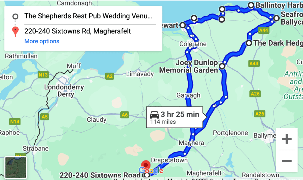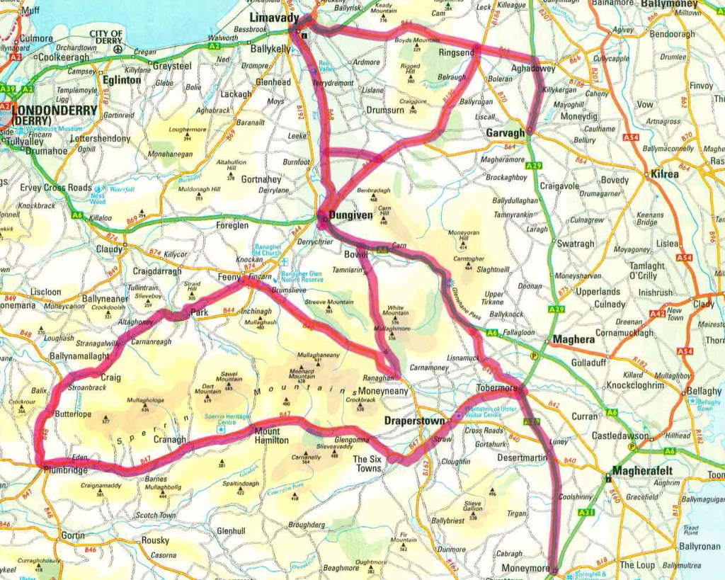 North, South-West & East Saturday Ride 2025. An option for Saturday is a decently big ride up by Binevenagh mountain to the north coast then south-west to Strabane on the border then east. back to base through the Sperrins.