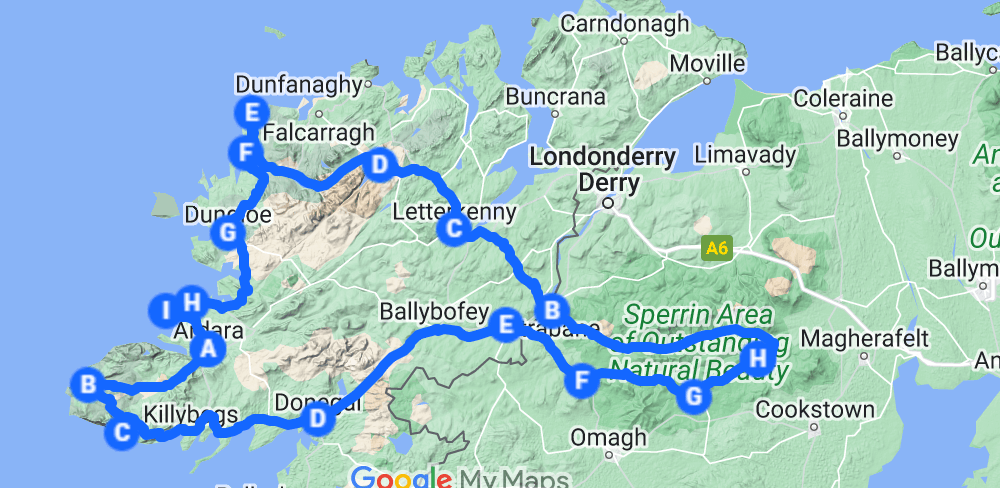 Route 8: Donegal trip: Strabane, Letterkenny, Glenveagh National Park, Bloody Foreland, Bunbeg, Dungloe, Portnoy, Dawross Bay, Ardara, Glencolumbkille, Slieve League cliffs, Donegal Town, Castlefinn, Newtownstewart, Greencastle.